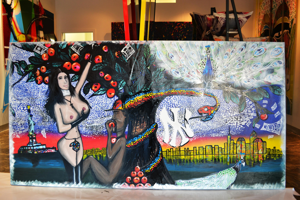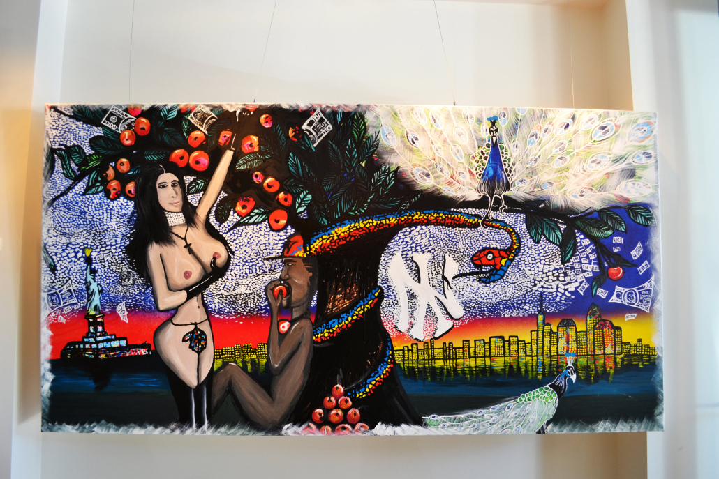 In this interpretation, the Garden of Eden has been replaced by the city that never sleeps: New York. The serpent no longer offers a fruit of knowledge but the lure of money and fame.