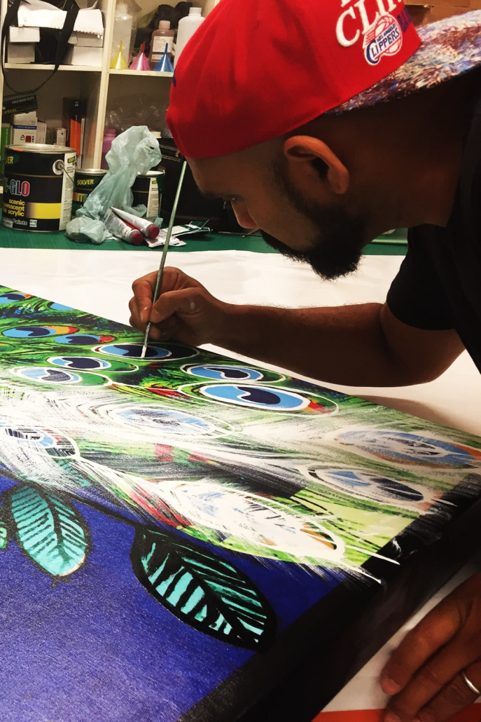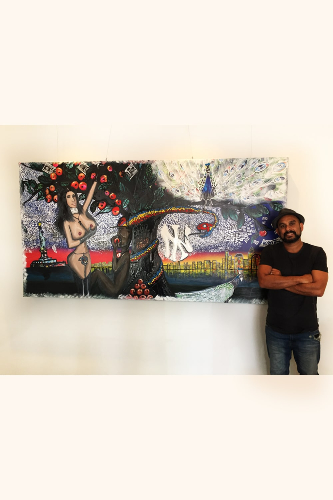 The serpent’s scales shimmer in colors of commerce and seduction, coiled around a tree rooted in both faith and fantasy. The peacock, a symbol of beauty and pride, stands watch — representing the allure of wealth, vanity, and the desire to be seen.