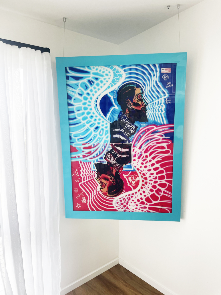 Inspired by the design of poker cards, the two-sided composition mirrors the dual realities of a hip hop icon — the authentic man and the public persona. Vivid red and blue tones echo the raw tension and unity of LA street culture, reflecting both the struggle and the light within it.